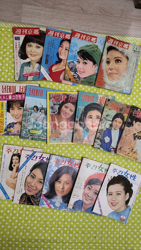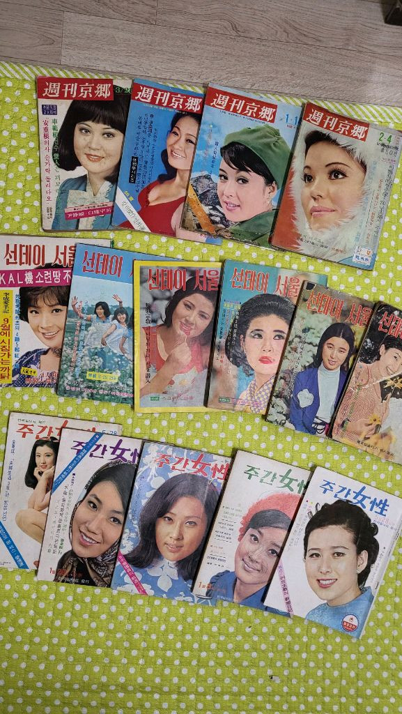 1번 선데이서울 주간경향 주간여성 15권 일괄 팝니다 주간여성 세권만 69년도꺼고 나머진 70년대 껍니다 상태는 50년 세월흐름 적당히 있고 낙장 훼손 있을 수 있습니다 감안해서 30만원에 처분합니다 무료배송 2번 명랑 10권 일괄 상태양호 8만원 송료4천원 3번 부부라이프14권(창간호포함)+부부저널1권 일괄 상태양호 12만원 송료4천원 28오이 3859 문자만 받습니다 채팅x