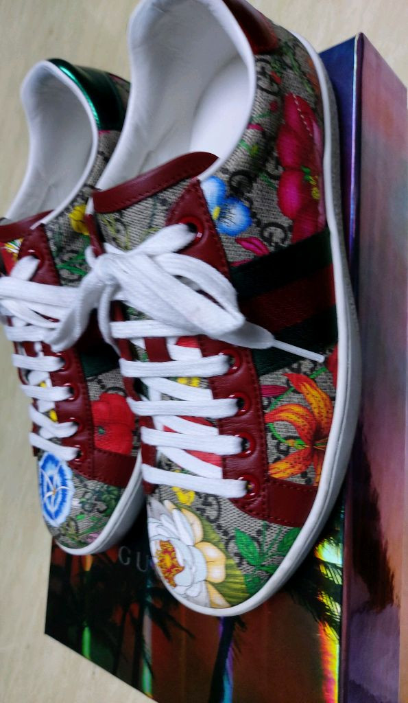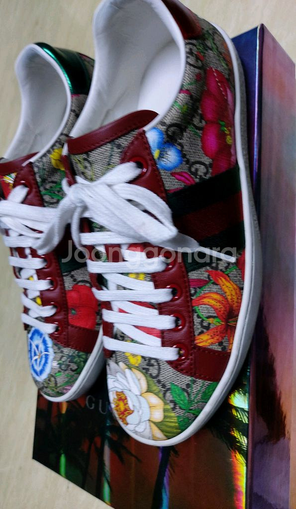 구찌 플로럴 스니커즈 정품입니다 사이즈 36 신세계백화점 센텀점에서 구입해서 몇번 착용하지 않고 깔끔하게 보관만 했던 상품입니다 꽃무늬와 시그니처 GG 패턴이 돋보이는 한정판 모델입니다. 상태 양호하고 박스도 함께 드려요.