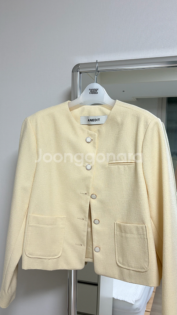ANEDIT의 아이보리색 라운드넥 자켓입니다 깔끔한 디자인으로 데이트룩이나 하객룩에 괜찮아요! 트위드 느낌나는 자켓으로 전체적으로 새옷과 다름 없지만 밑단 안쪽에만 살짝 바지에 쓸림이 있어요! 겉으로는 안보이는 점 참고 부탁드립니다