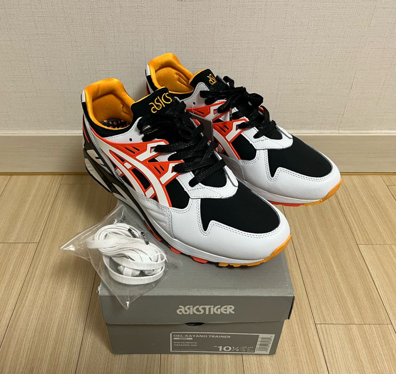 아식스 젤 카야노 트레이너 해피 카오스 팩 화이트 오렌지 블랙 1191a200-100 asics kayano trainer happy chaos pack white 1191a200 100 제품텍 그대로 달려있는 미착용 새제품으로 아식스 타이거 정품입니다. 해피카오스 팩 입니다. 사진은 올리기 직전에 찍은 것이고 사진과 동일한 상태로 보관하고 있습니다. 사이즈는 US10.5 (282.5mm)입니다. 아식스의 경우 사이즈가 'US10 --> 280mm', 'US10.5 -->282.5mm', 'US11 -->285mm' 이렇습니다. 사진의 구성품(여분끈 1쌍, 구입당시 아식스 정품 박스, 신발안 종이뭉치, 제품텍) 모두 보내드립니다. 겉에 일반박스로 이중포장해서 보내드립니다. 택포 65,000원입니다.