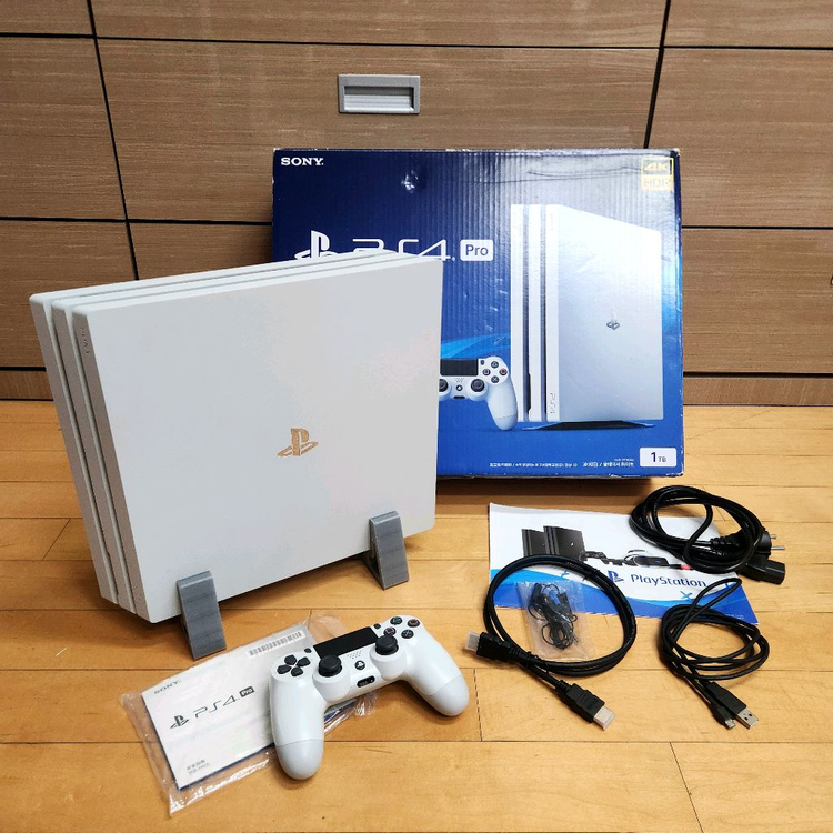 PS4 PRO 1TB 화이트 판매합니다 7117B 모델 본체 및 케이블, 듀얼쇼크 기본구성에 소니 정품 듀얼쇼크 충전기, 3D 프린팅 수직 거치대 서비스로 같이 드립니다. 컨디션은 생활기스 정도만 있고, 눈에 띄는 큰 기스나 제품 하자는 없습니다. 사진 촬영 후, 시스템 초기화 해두었습니다.