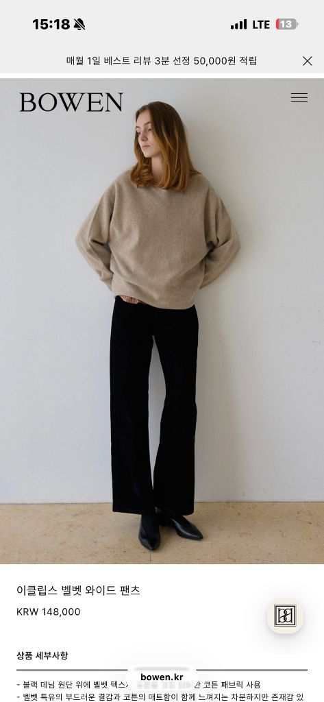 보웬 이클립스 벨벳 와이드 팬츠