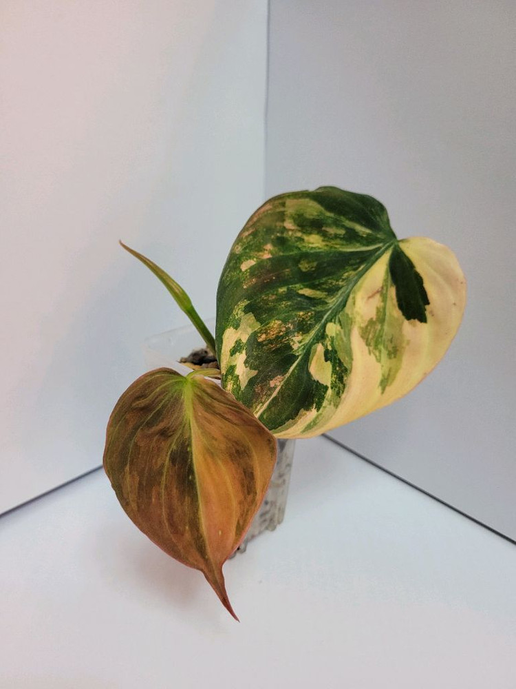 필로덴드론 핑크 미칸 바리에가타입니다 번식환경이 식물등과 멀다보니 아직 발색은 부족합니다만, 식물등 아래에서 키워주면 기존잎처럼 이뻐질거에요. 벌브무늬도 아주 좋아요 직거래/택배(우체국) 모두가능합니다. 택비비는 5천원입니다