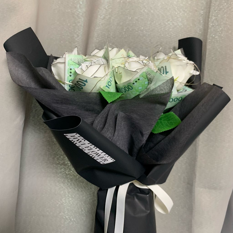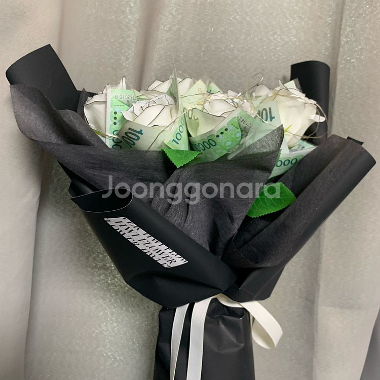 선물받은 돈 꽃다발입니다. 꽃다발은 샤넬 느낌으로 제작되어있으며, 비누꽃입니다. 꽃은 총 10송이에, 만원짜리 지폐도 끼워져 있습니다. 총 현금 10만원 + 비누꽃 10송이 + 전등까지 다해서 15만원입니다. 선물용으로도 좋아요 ㅎㅎ 보관만 해서 컨디션도 최상이고, 하자도 일절 없습니다.