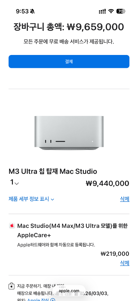 Apple 맥 스튜디오 M3 Ultra 모델입니다 32코어 CPU, 80코어 GPU, 32코어 Neural Engine 96GB 통합 메모리 2TB SSD 저장 장치 Thunderbolt 5 포트 2개, SDXC 카드 슬롯 Thunderbolt 5 포트 4개, USB-A 포트 2개, HDMI 포트, 10Gb 이더넷 포트, 3.5mm 헤드폰 잭 외장 디스플레이 최대 8대 지원 9659000원(애캐풀 포함 구매) 뜯지않은 새상품