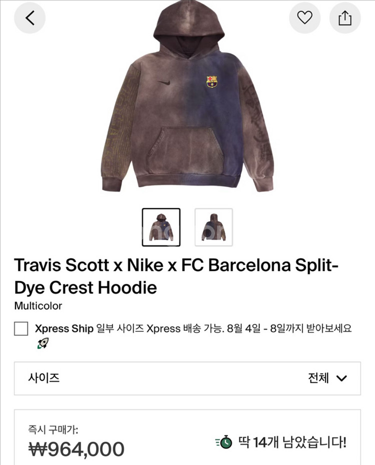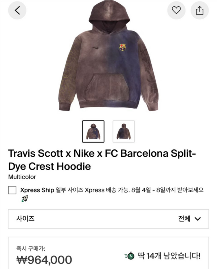 개인정보(거래정보)를 주고받는 행위는 사기에 노출될 수 있으므로 즉시 중고나라로 신고해 주세요나이키와 바르셀로나, 트래비스 스캇의 콜라보로 제작된 후드티입니다 - XL 사이즈입니다 - 독특한 디자인으로 소장 가치가 높습니다 콜라보 제품이라 희소성이 높고, 스타일리시하게 연출하기 좋습니다 미개봉입니다 연락주세요