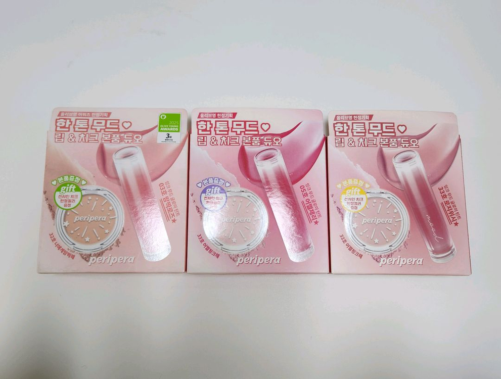 페리페라 잉크 무드 글로이 틴트 X 맑게 물든 선샤인 치크 2025 올리브영 어워즈 한정기획 미개봉 새상품 03 맘찍로즈 + 32 너에게맘찍해 (-27.10.20) 05 어쩔체리 + 33 어쩔핑크해 (-27.10.03) 33 로지위시 + 33 어쩔핑크해 (-28.04.19) 개당 가격입니다 반값택배+1800 일반택배+3800