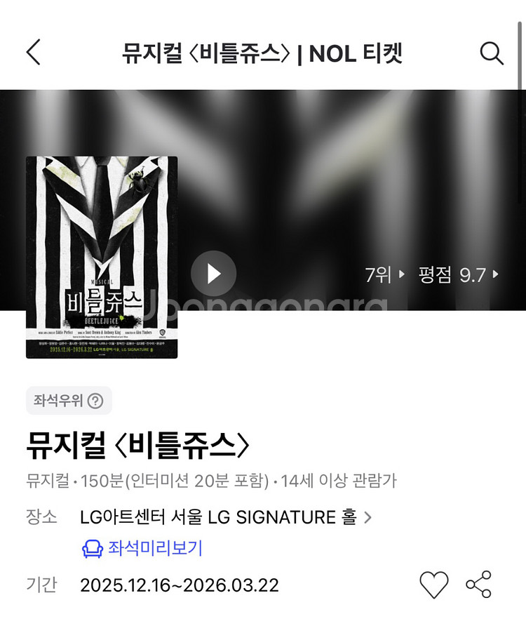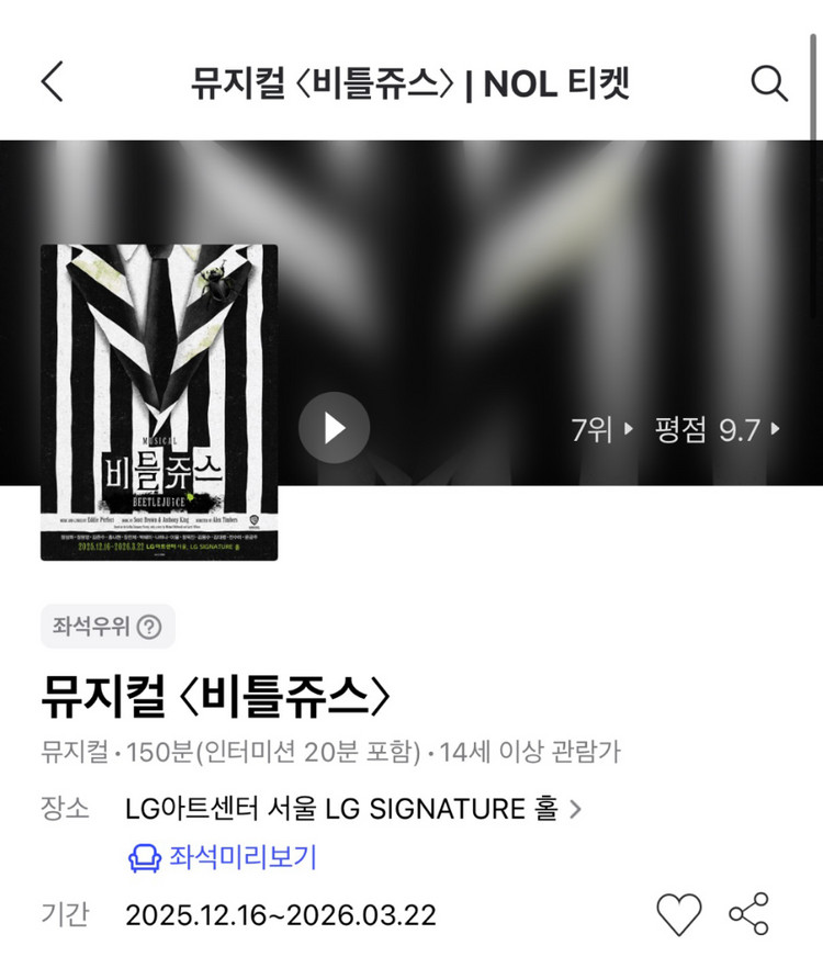 제가 오늘 서울을 가야하는데 가지를 못하게 폭설로 인해서 못가게 되어서 표 판매합니다. * 1시까지 판매안될시 반값에 처분합니다. 제발 살려주세요 비행기도 날려서 기분이 별로 안 좋아여… 뮤지컬 <비틀쥬스> 2/8일(오늘) 입니다. 장소 : LG아트센터 서울