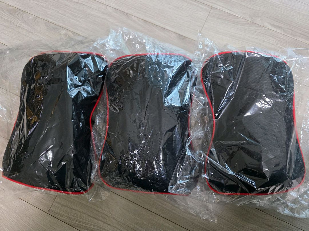 차량용 목쿠션 3개 세트입니다. 블랙 컬러에 레드 파이핑으로 포인트를 준 깔끔한 디자인이에요. 아직 포장지에 싸여있는 미사용 제품입니다.