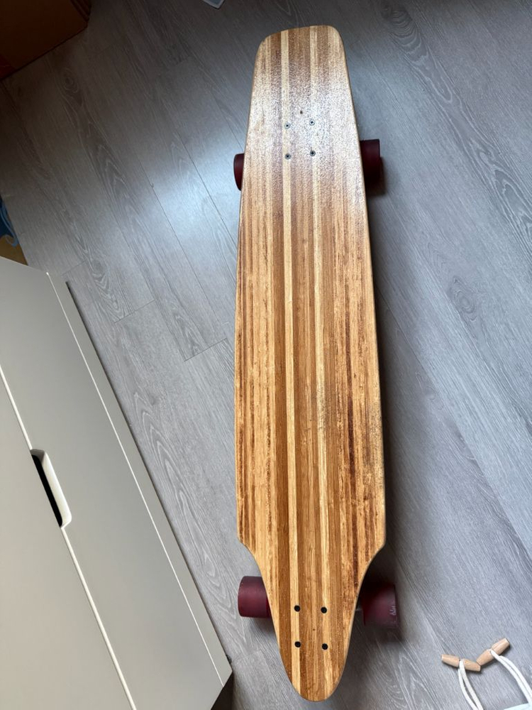 자작나무 소재의 롱보드예요. 레드 컬러 바퀴가 포인트로 되어있고, 전체적으로 상태가 양호합니다. 긴 거리 라이딩이나 스타일링용으로 좋을 것 같아요!