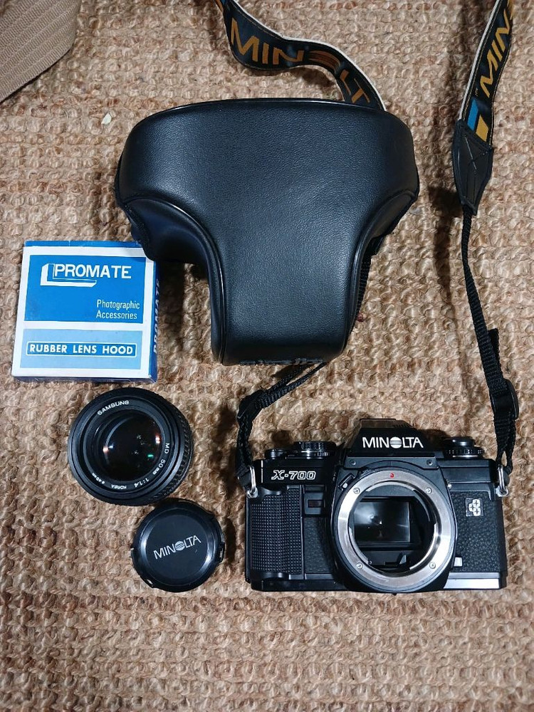 미놀타 X-700 카메라에 삼성미놀타 50mm f1.4렌즈 까지 드리는 세트 상품입니다. 카메라 보관에 용이한 가죽 케이스와 스트랩,어깨가방 까지 챙겨드려요. 렌즈 후드도 함께 있어서, 렌즈 보호도 문제 없습니다. ### 랜즈별매 ## 35-70MM ₩80,000 60-300mm ₩100,000 문의 없으시면 바로 안전결제해주시면 됩니다!
