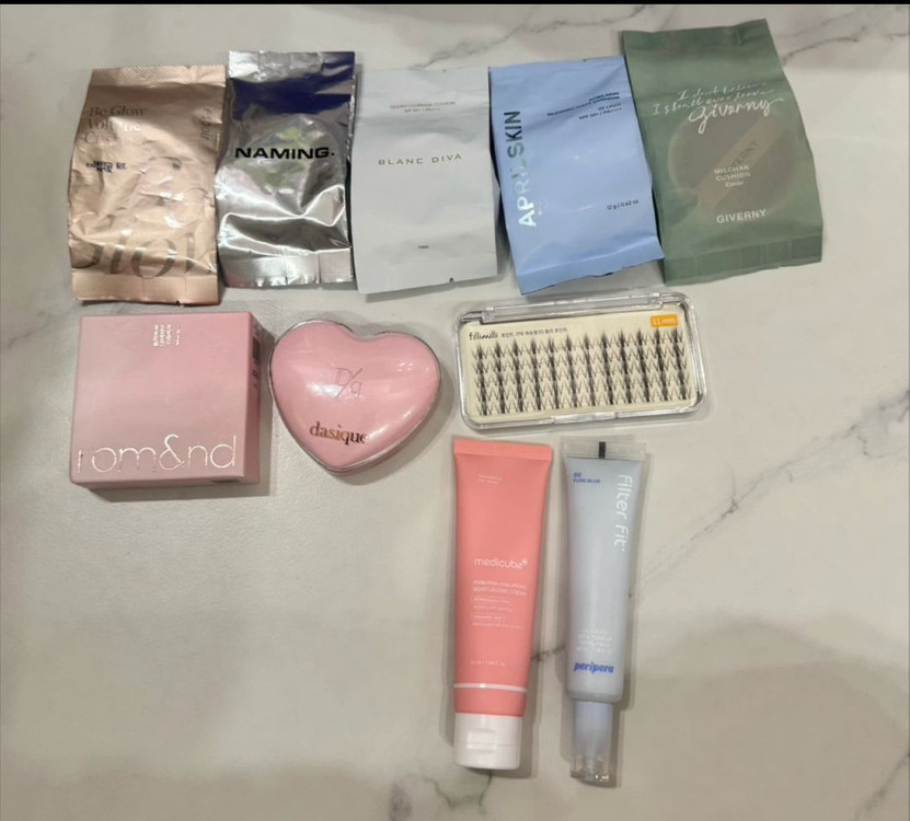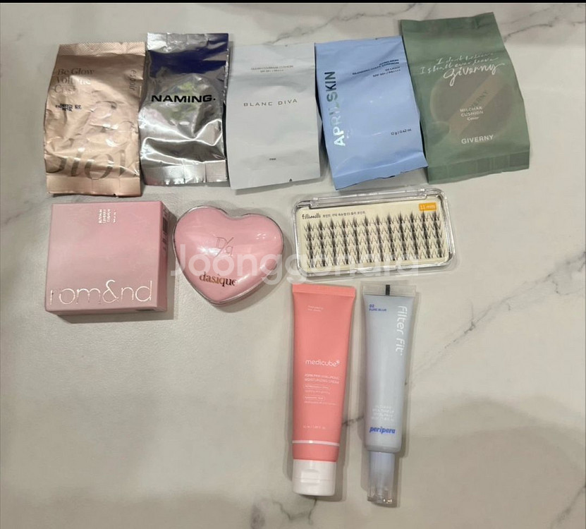 > 에이프릴스킨 글로잉매트 쿠션 (02 라이트) 26.11.13까지 12000원 -지베르니 밀착 커버 쿠션 (23 미디움 배이지) 26.12.17까지 11000원 -에스쁘아 비글로우 볼륨 쿠션 (22 페탈) 27.12.09까지 13000원 -블랑디바 글림 커버리지 쿠션 (핑크) 28.08.17까지 13000원 -네이밍 제로 그래비티 커버 업쿠션 (21N) 28.05.06까지 12000원 -롬앤 블룸 인 커버핏 쿠션 (23 페탈 베이지) 27.06.10까지 15000원 - 데이지크 워터 듀이 젤 쿠션 (23N) 27.10.23까지 17000원 -필리밀리 포인트 가닥 속눈썹 05 돌리포인트 11mm 12000원 -메디큐브 피디알엔 핑크 히알루로닉 수분 크림 20000원 -페리페라 필터 핏 밀크 톤업 02퓨어 플루 한번사용했습니다 10000원