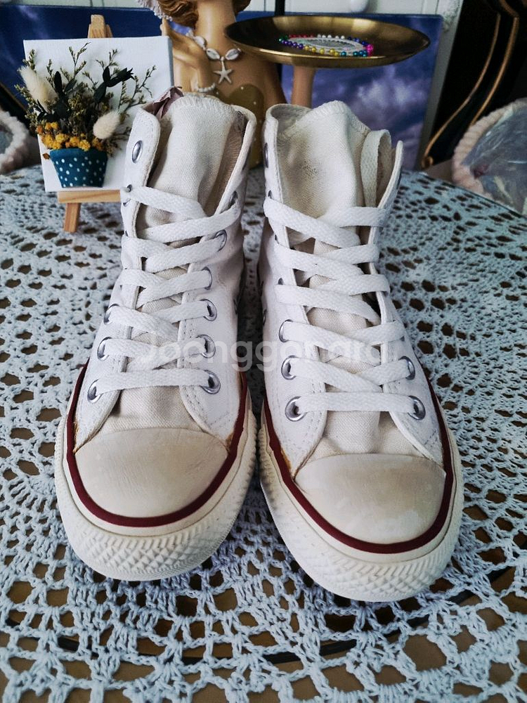 클래식 하이탑 스니커즈예요. 화이트 컬러에 레드 밑창으로 깔끔하고 예쁜 디자인이에요. 착용감 있지만 전체적으로 상태 양호한 중고 제품입니다.