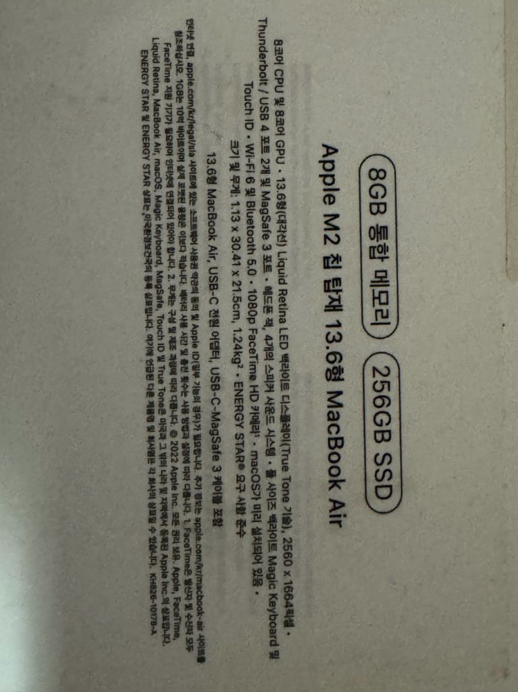 M2 칩셋 노트북 모델로 8GB 램과 256GB SSD 구성입니다. 상태 양호하며 정상 작동하는 제품이에요. 배터리 싸이클 4로 새상품 컨디션 입니다 박스 충전기 드립니다 청주 직거래 가능