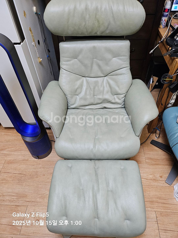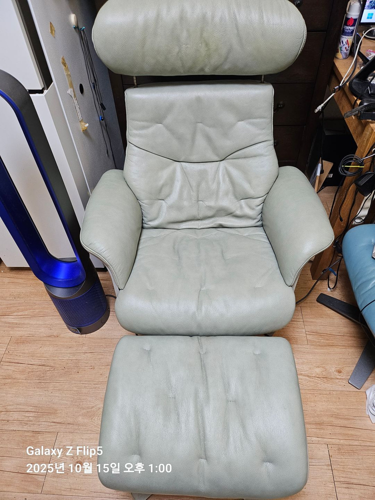 체리쉬 가죽 리클라이너 의자 고급 가죽 소재의 리클라이너 의자예요. 헤드레스트와 발받침까지 포함된 세트로 상태 양호합니다. 편안한 휴식을 위한 완벽한 의자입니다.