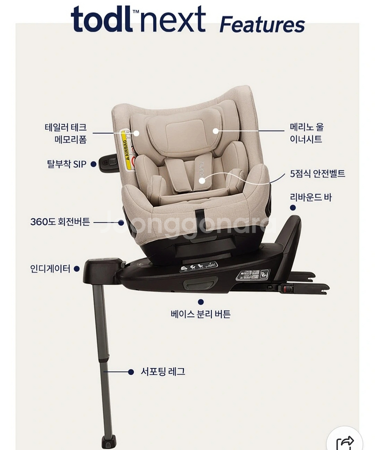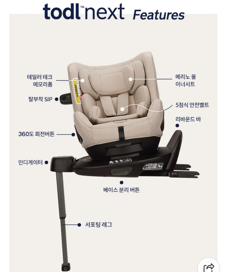 동일제품 선물받게되어 싸게 판매합니다. 저희 아기가 쓸 카시트 직접 발품팔며 고른거고 진짜 좋은 카시트에요. 베이비하우스에서 구매했고 공홈 판매가 105만원 입니다. 👶 뉴나 토들넥스트 박스만 개봉한 새상품 싸게 판매합니다. 박스는 버렸고 비닐은 뜯지않은 상태입니다. 비스코티 색상이고 고급스럽고 이뻐요. 💚 베이스 + 토들넥스트 + 차량시트 보호 매트 + 후방거울까지 같이드려요! 💙 새상품으로 정품등록 및 a/s 다 가능합니다.💙 배면각도가 잘 나와서 신생아부터 18kg 까지 사용 가능하고, 엄마도 허리숙임없이 크게 힘 안들이고 한손으로 회전 가능해요. 조리원에서 집갈때부터 사용 가능하고, 신생아 이너시트가 있어서 바구니카시트 따로 사지않아도 됩니다. 직접 발품팔며 사용편의성과 안전성 깐깐하게 보면서 고른 카시트에요. 쿠션감도 다른 카시트처럼 그냥 딱딱하기만 한게 아니라 2중레이어 폼으로 탄탄하고 4단계 충돌 보호 시스템으로 더 안전하게 사용 가능합니다 아기 피부에 닿을 수 있어서 꼼꼼히 따져보았는데 프리미엄 소재라 부드럽고 좋아요. 마그네틱 버클 홀더도 있어서 아기 태울때 편하고, 시트 커버도 쉽게 탈부착 가능해서 세탁이 간편하고 업체에 맡기지 않아도 됩니다. 아기용품 매장에서 직접 비교해보시면 더 와닿으실거에요. 카시트 미리 준비했는데 동일제품 선물받게되어 하나 판매해요. 둘째때 쓸까하고 박스뜯고 비닐채로 한달가까이 보관만하다가 아직 먼 일이라 그냥 판매합니다. ADAC 2.3 점, 이중레이어폼 등 상세 정보는 아래 링크에서 확인 가능합니다. https://naver.me/xKt6iw2p