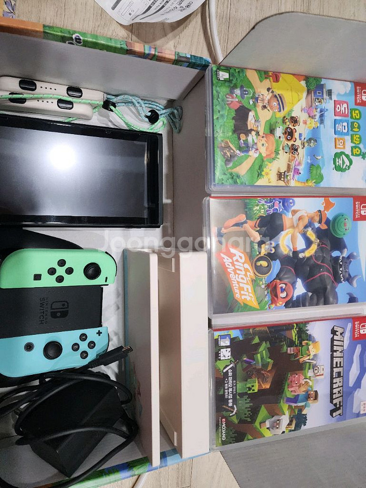 닌텐도 스위치 모여봐요 동물의숲 에디션입니다 살때 75만원 정도주고 샀어요 지금은 많이 내렸네요ㅜㅜ 게임칩 마인크래프트도 4-5만원대, 링 피트도 7-8만원대 주고샀어요 ㅜㅜ 아들놈시키 마인크래프트랑 동물의숲만 두손 꼽을정도로 건드리고 링피트는 건드리지도 않고 장롱서 먼지만 쌓여놓고있었어요 상태 좋습니다 ㅜㅜ 저 민트 가방은. 뭔지 모르겠는데 암튼 닌텐도 살때 같이 구매한거 같아요 반품, 환불없이 다해서 택포. 30만원 할게요 ㅜㅜ