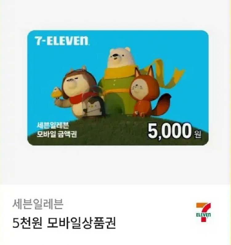 세븐일레븐 모바일 금액권 5천원권 2장입니다. 유효기간 내년 2월까지에요~ 편하게 채팅주세요^^