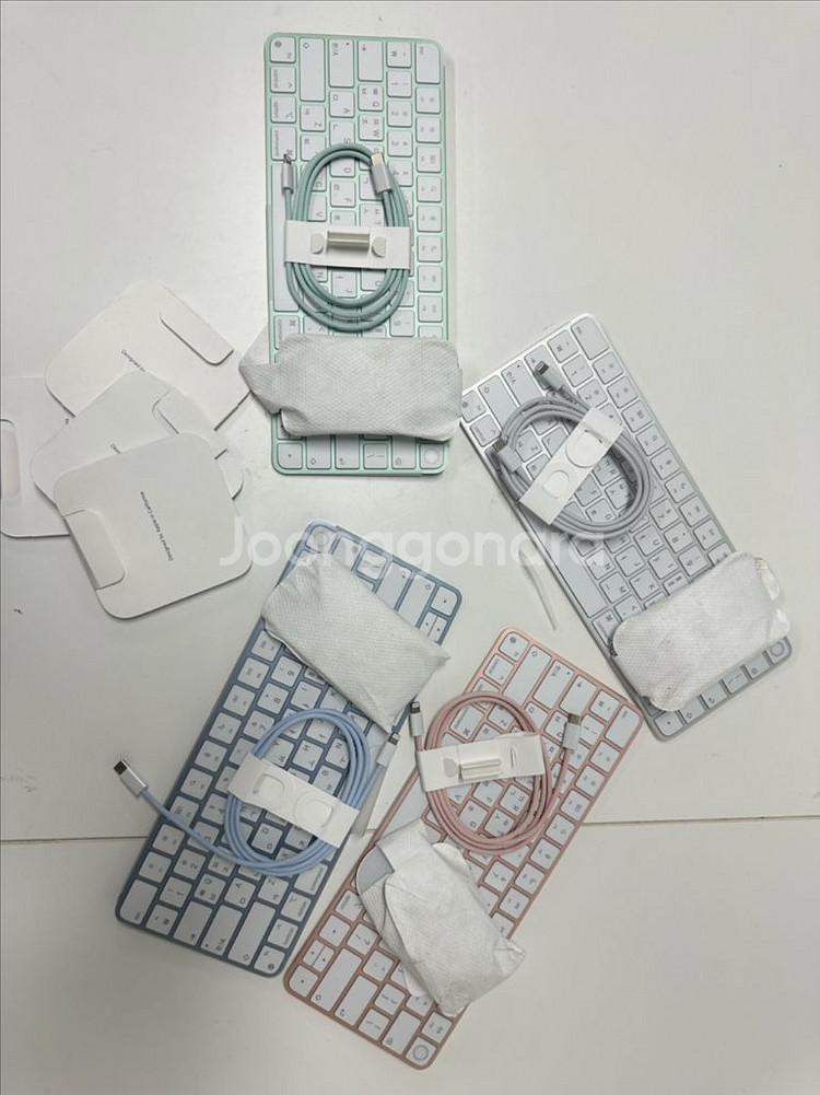 정품 애플 키보드 마우스입니다 Cto8핀 선 있어요! 낱개로는 팔지 않고 세트로 팔고 있습니당ㅎㅎ 색상은 화이트, 블루, 그린, 핑크 총4개입니다 착불로 택배 거래하겠습니다 네고 싹 해버렸습니다 애플 맥 구매 후, 사무실에서는 다들 개인 키보드, 개인 마우스 써서 새 제품이 남아 판매합니당