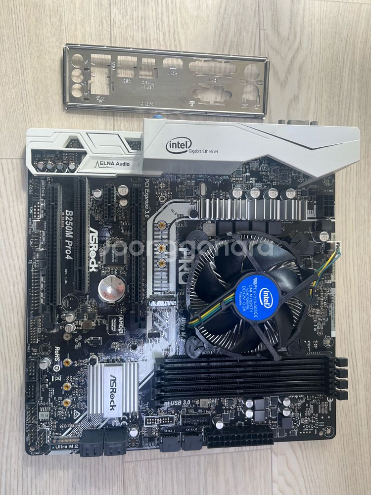 cpu와 메인보드 팝니다. 인텔 i5-7600 메인보드 B250M PRO4 백판넬 포함 기본쿨러 달려있습니다 사무용 컴퓨터에서 분리했고 방금전까지 사용했습니다