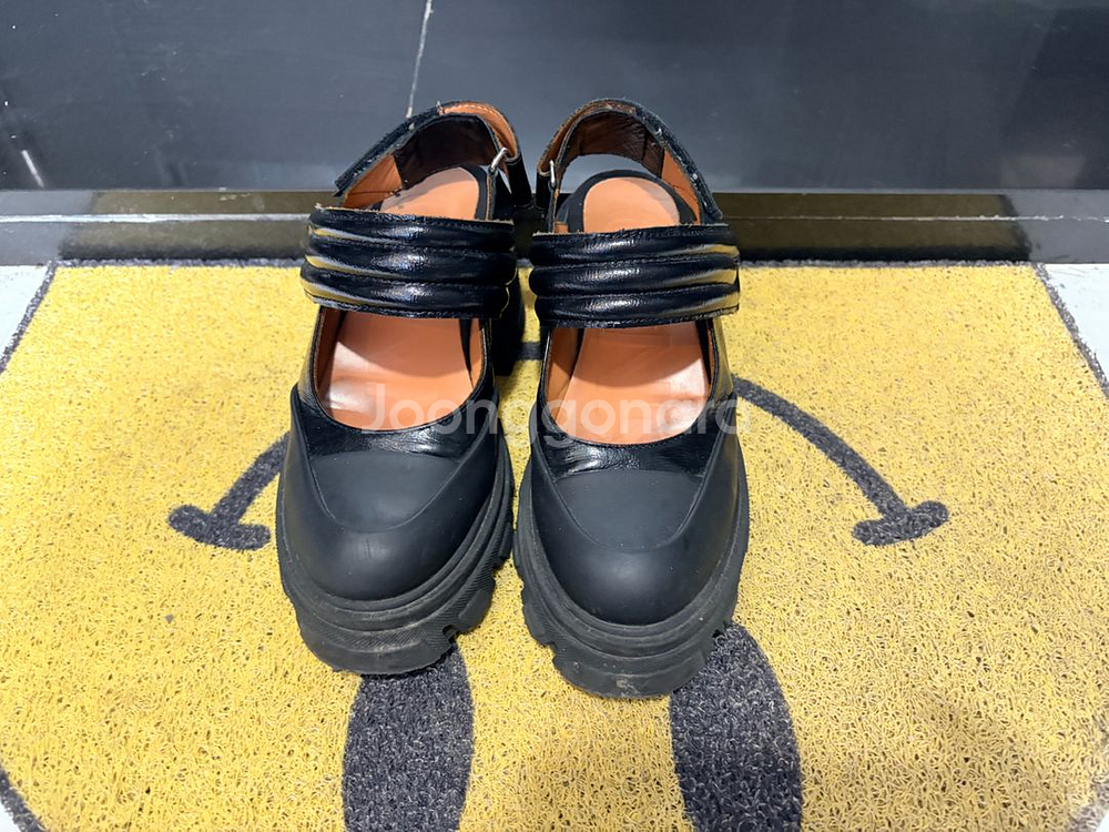 가니 블랙 메리제인 스타일 플랫폼 샌들이에요. 두꺼운 솔과 브라운 안감으로 포인트를 준 디자인이 특징입니다. 정품이구요 키높이효과가 있어서 치마든 바지든 다이쁘게 어울려요 사용감이 있어서 싸게 내놓습니다
