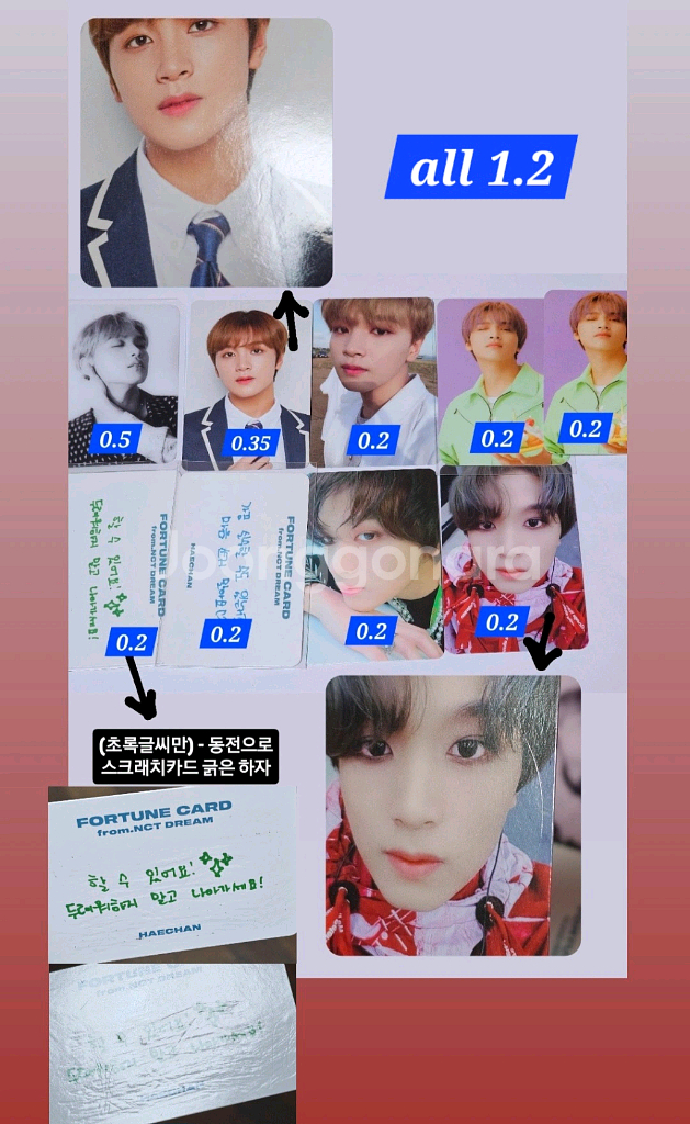 첫 번째 사진 전체 일괄 : 12,000원 개별 구매 가능 하자는 사진 속에 모두 표시되어 있습니다 두 번째 사진 전체 일괄 : 12,000원 개별 구매 가능 두 번째 사진 속 포카는 하자가 없지만, 너무 예민하신 경우에는 구매를 추천드리지 않습니다. 원하시는 분에 한하여 세 번째 사진의 포카를 무료로 함께 발송해드립니다 (심각한 하자, 카드재질 상 비닐과 코팅이 붙어서 하자가 생겼고 따로 확인 영상 및 사진 불가합니다)