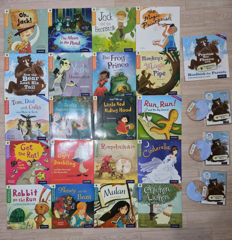 유명한 옥스포드 대학 출판사의 파닉스 연습을 위한 전래동화 시리즈 입니다 책은 총 20권 가이드북1권 cd 3장 책들은 모두 새책 수준 입니다 cd도 비닐 개봉만한 거의 새거에요 구성품들은 한개도 빠짐없이 다 있어요 서울 양천구 직거래 선호 택배는 추가 4000원 네고사양