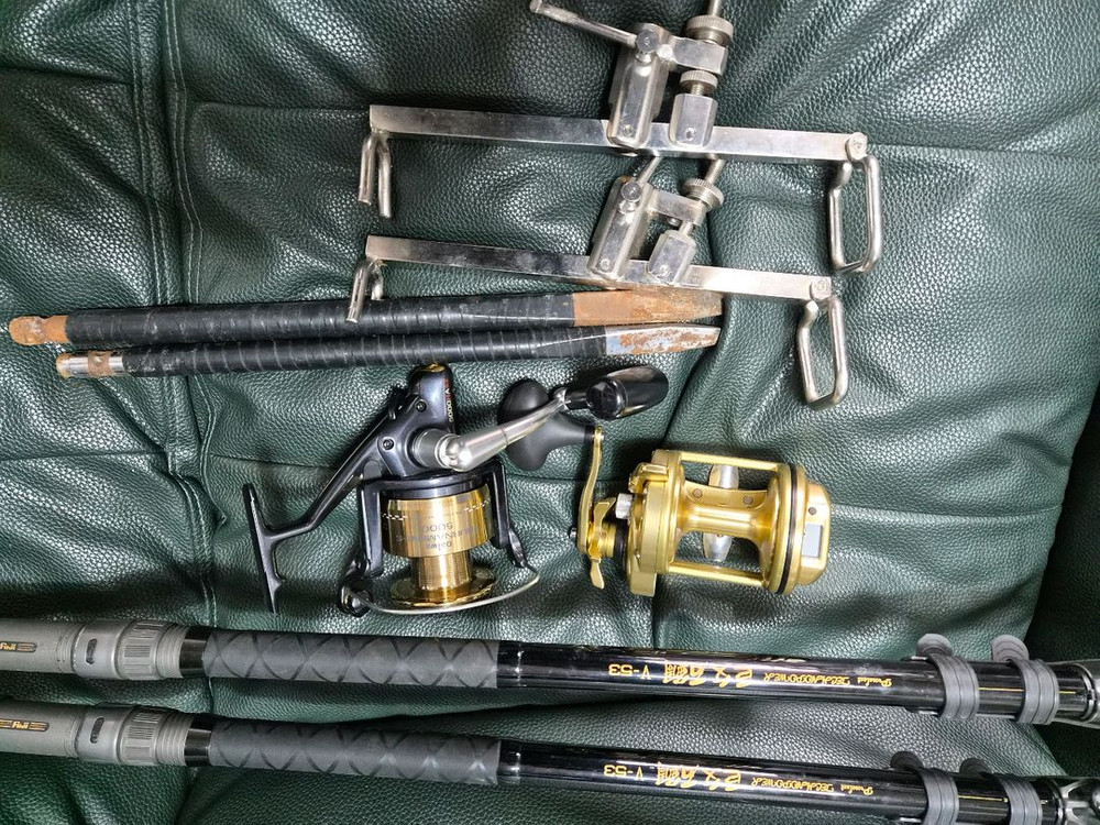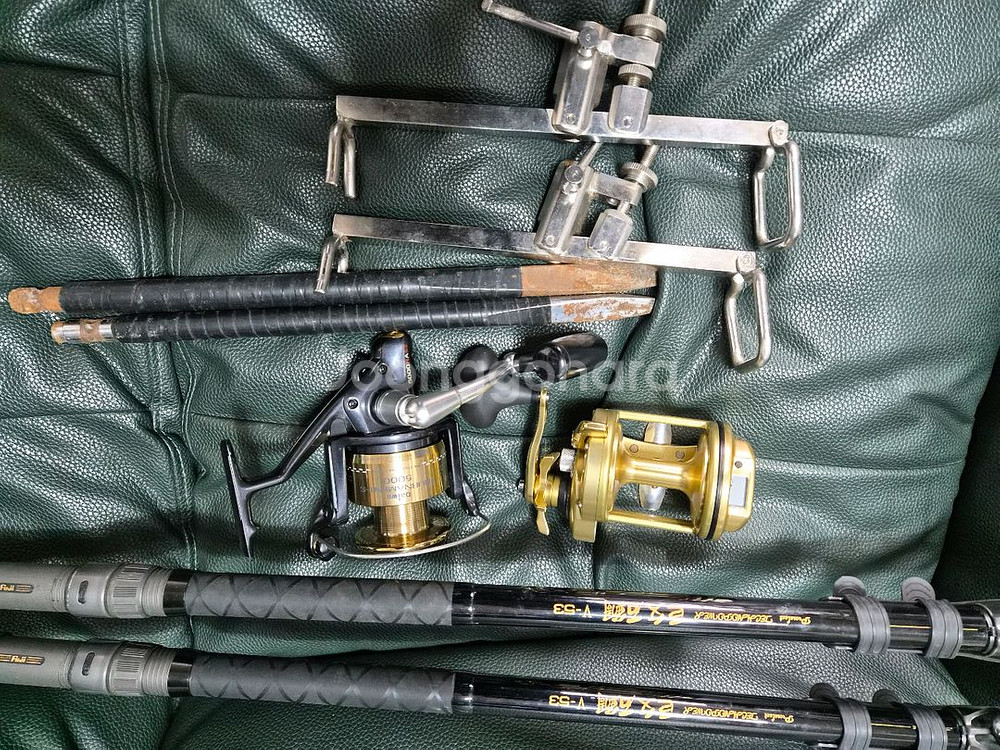 대형 낚시대와 릴, 각종 액세서리가 포함된 완전한 세트입니다. 사용감은 있지만 기능상 문제없이 잘 작동하는 상태예요. 대형 물고기 낚시에 최적화된 고급 장비들로 구성되어 있습니다. 돌돔용 입니다.