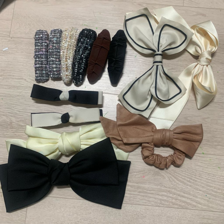 폐업 정리로 사진 속 헤어핀 일괄로 판매 합니다 트위드 핀 사각 2개 트위드 삼각핀 2개 셔링핀 2개(블랙,브라운) 그외 리본핀 6종 브라운 가죽 스크런치 1개 총 13종 판매해요.