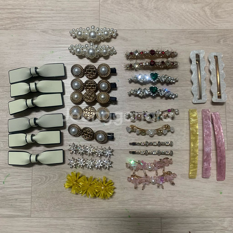 다양한 디자인의 머리핀 세트입니다! 진주, 큐빅, 리본 등 여러 스타일이 섞여있어 좋아요 국내생산으로 엄선해서 모았는데 많이 팔고 재고 이거 남았네요. 리본핀 6개 진주핀 2개 빈티지스타일핀 5개 별 큐빅핀 2개 노란 비즈핀 1개 빨간 큐빅핀 2개 초록하트보석핀 2개 기타 보석핀 6개 아세테이트(프랑스핀) 5개 총 31개