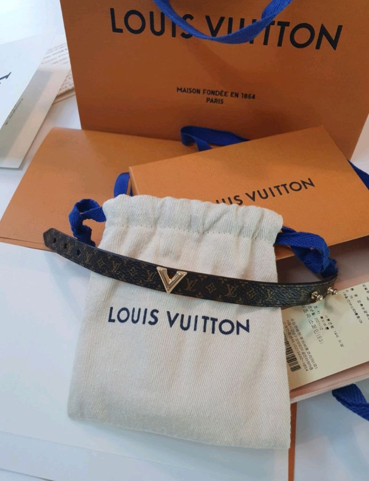 루이비통 에센셜 V 팔찌입니다 루이비통 공홈구매 했고, 구입시 받은것들모두 다 있습니다 아껴 차느랴 몇번안했는데 잘안하고 모셔두기만해서 판매합니다 사이즈는 17 까지 가능하고 저는 14정도 되는데 마지막 사진이 제 착용사진입니다 애눌문의 답변 안해요 챗주세요