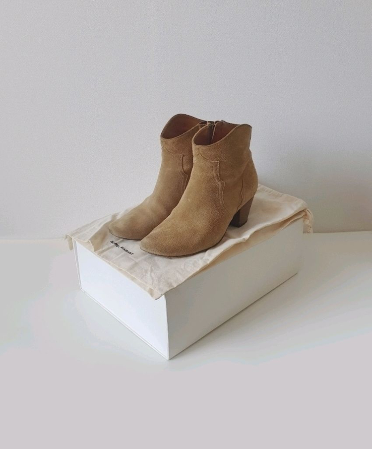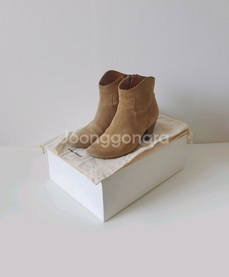 이자벨 마랑 DICKER 부츠입니다. 카멜컬러이구요 굽은 6cm정도입니다. 사이즈는 37로 235 사이즈 생각하시면 될거 같아요 재질은 100프로 카프 벨벳 레더이구 Made in France 입니다. 제가 현백 마랑 매장에서 직접 구매했던 제품입니다. 박스 더스트백 다 있습니다.