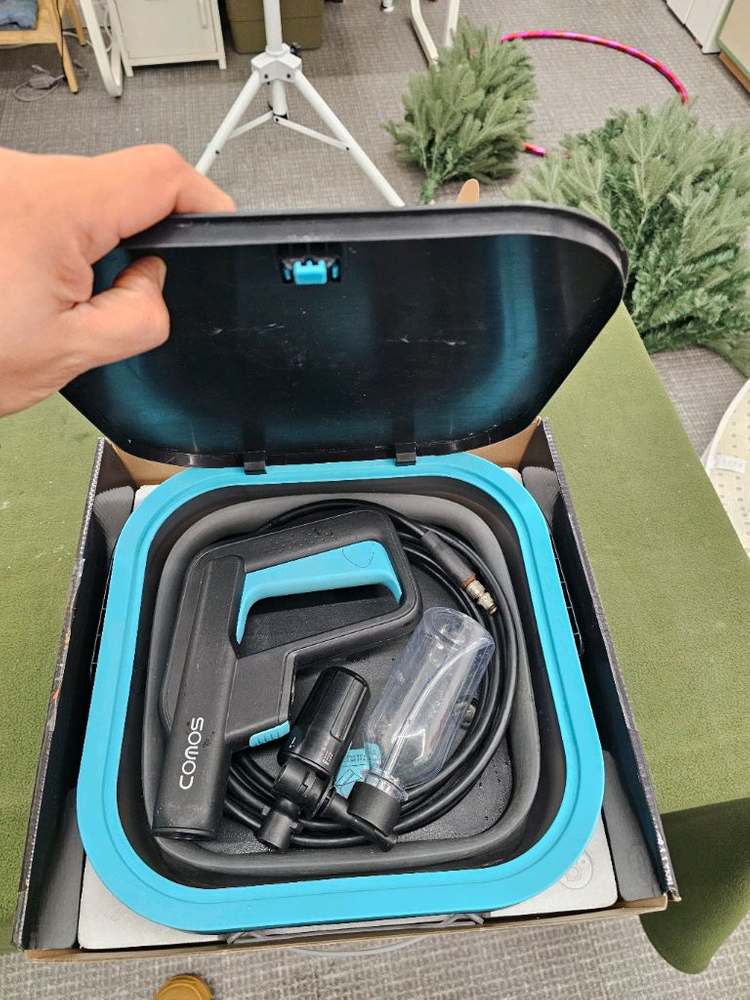 휴대용 고압세척기 세트입니다. 본체, 충전기, 호스 등 구성품이 모두 포함되어 있고 외관상태는 사용감있지만, 최근 as맡겨서 내부는 새거입니다 작동 잘 됩니다. 차량이나 소품 청소에 유용한 제품입니다. 인천 주안 직거래합니다 쿨거래시 네고해드려요