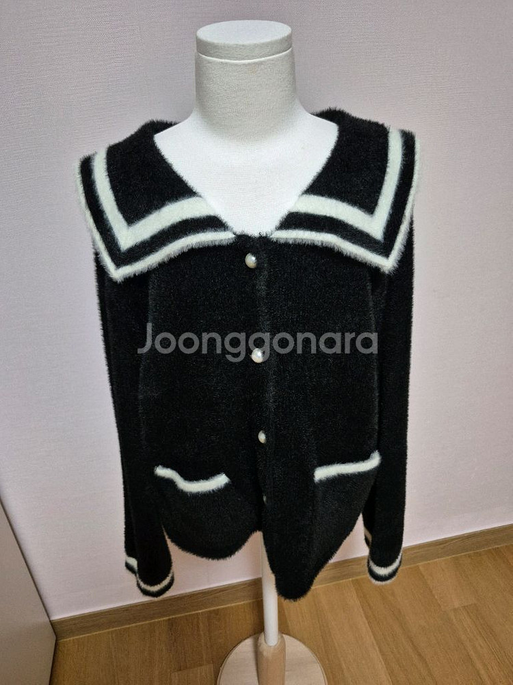 세일러복 스타일 가디건이에요. 블랙 베이스에 화이트 트리밍으로 포인트가 되는 디자인이고, 상태 양호합니다. 키즈160사이즈 활용도 좋습니다