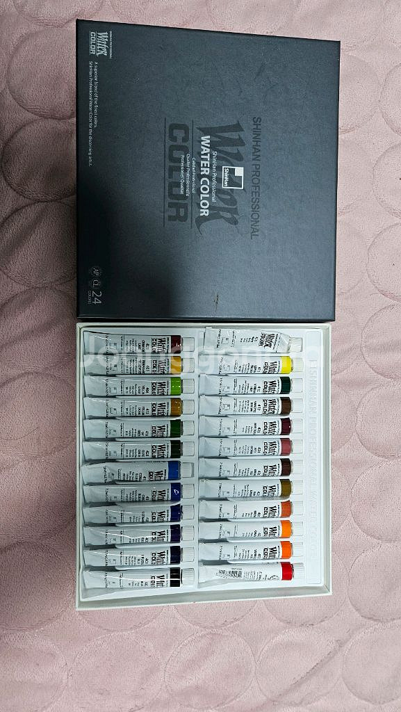 신한화구 전문가 수채화물감 세트 24색 (각 7.5ml) 팔아요 사진과 같이 몇몇 색은 사용한 흔적이 있습니다. 화이트와 세룰리안 블루 휴를 가장 많이 사용했습니다.