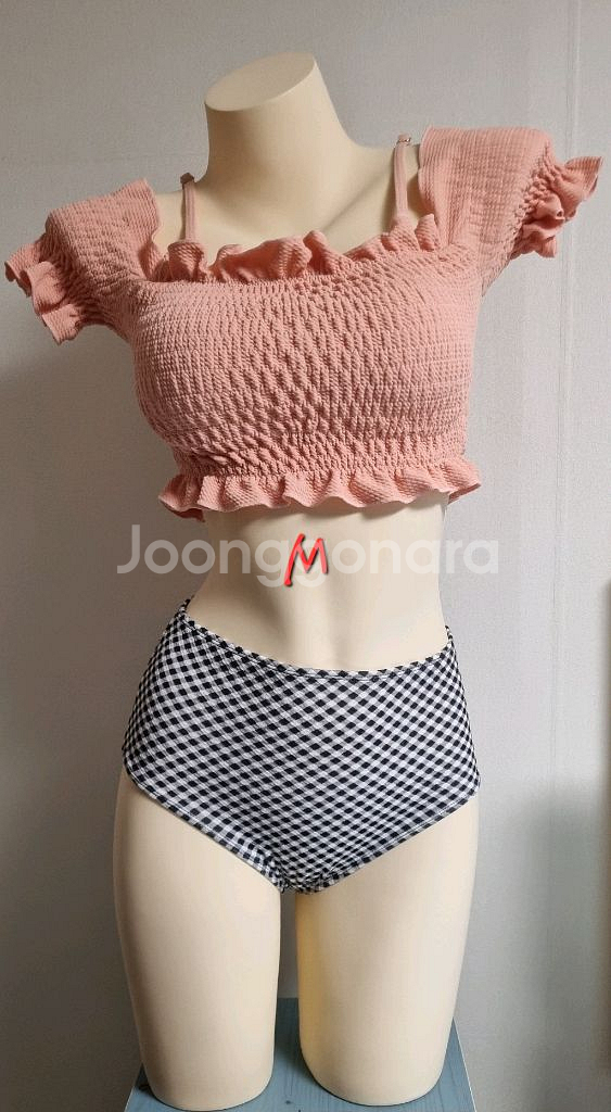폴웨어 상하의 세트예요. 핑크 크롭탑과 블랙&화이트 체크 팬티로 구성되어 있고, 프릴 디테일이 예쁜 M사이즈입니다.