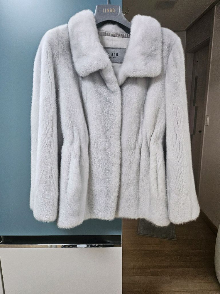 진도모피 쇼밍크 입니다. 택보시면 얼마 안된거 아실꺼에요 어깨랑 목 부분 미세 변색 있습니다. 입으면 티 안나요 예민하시면 패스해 주세요 밍크가 두툼하고 모질이 빽빽해요 소매도 안까지 넉넉하게 되어 있습니다. 원래 스트링 없는 모델인데 추가했어요 카라에는 자석이 있어서 편해요 바이올렛 컬러 아주 연한 회색 느낌입니다. 55~마른 66까지 여유있을듯해요 가슴단면 52입니다.