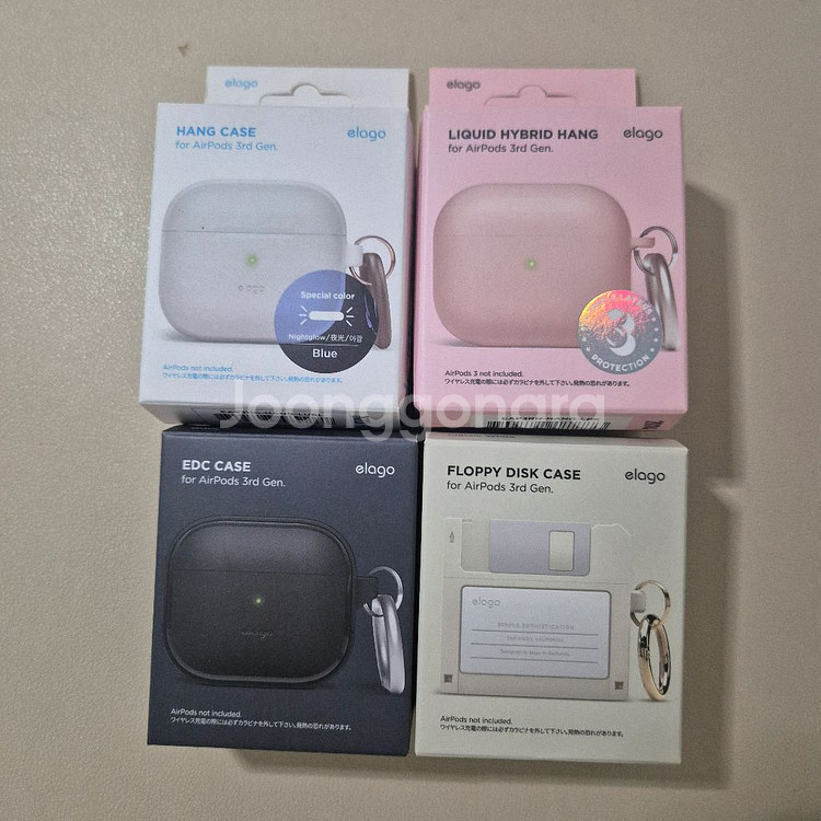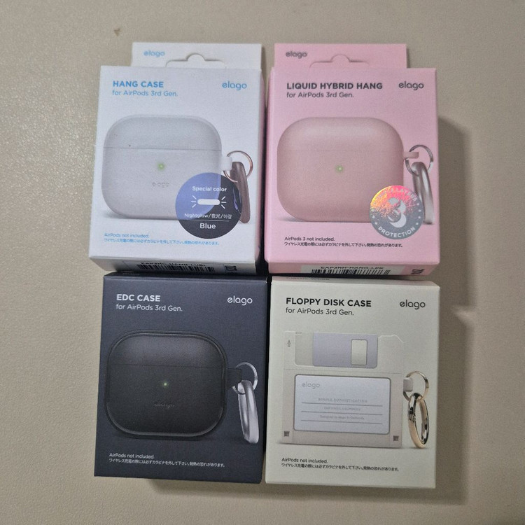 엘라고 에어팟3 케이스들입니다 부속품 작은 링 빼고 전부있고 검은색케이스는 사용감이있고 야광케이스는 조금 노랗게되어서 개당 3500원정도쳐서 택포 13000원에 보내드려요~ 개별판매는 하지않습니다 안전번호로문자주세요!