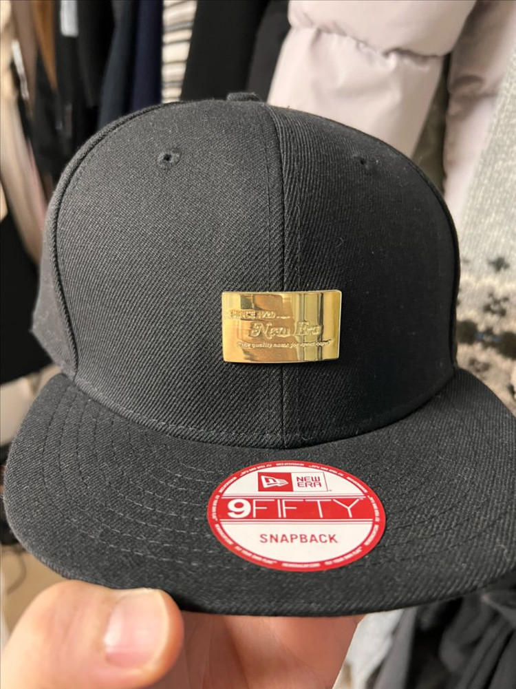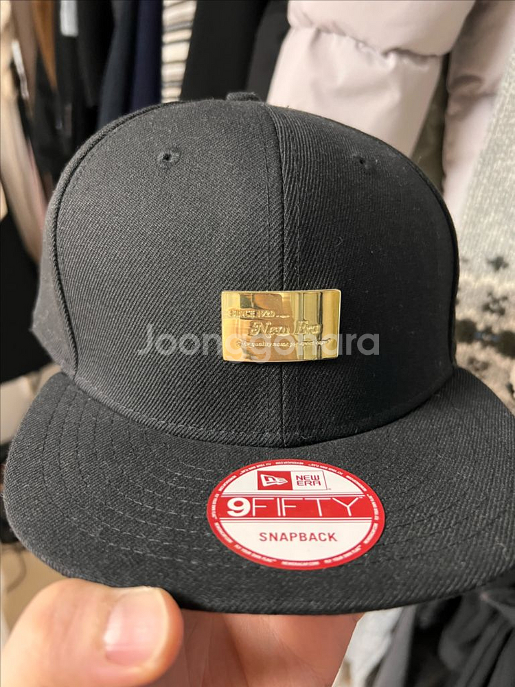 브랜드 콜라보 스냅백 모자예요. 블랙 컬러에 골드 로고가 포인트로 들어가 있고, 새 제품 상태로 깔끔해요. 정품 인증 가능한 프리미엄 모자입니다.