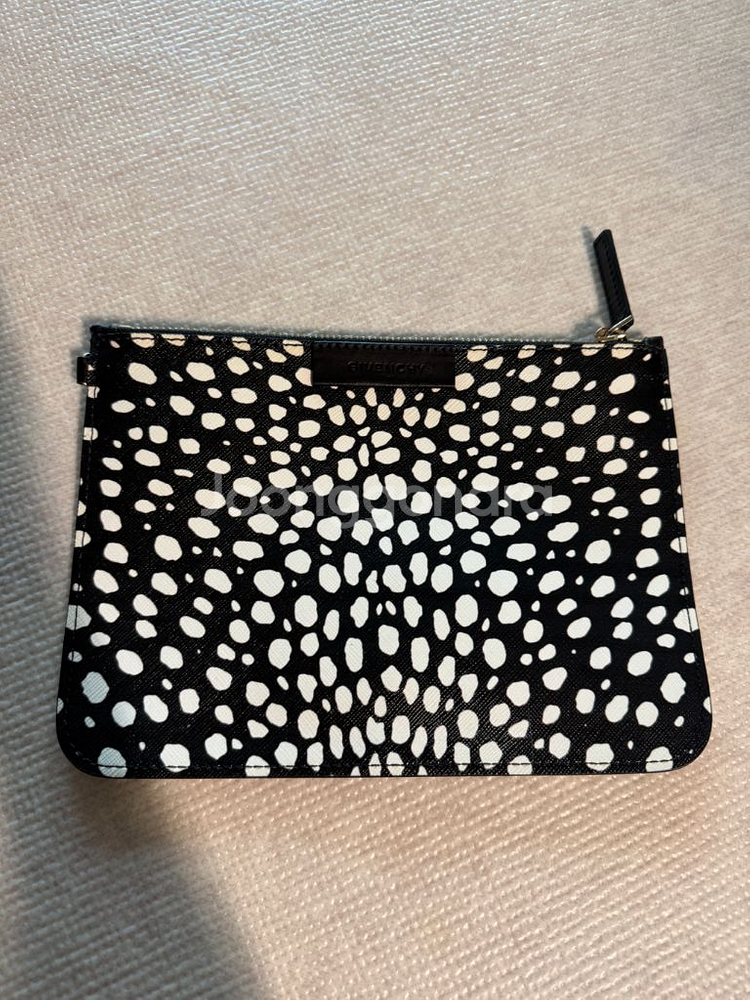 지방시 정품 도트 패턴의 미니 클러치백이에요. 100정도 줬어요 블랙 바탕에 화이트 도트가 깔끔하고 세련된 디자인입니다. 새상품인데 뒤에 뭐가 묻었어요 전문 클리너로 지워질거예요