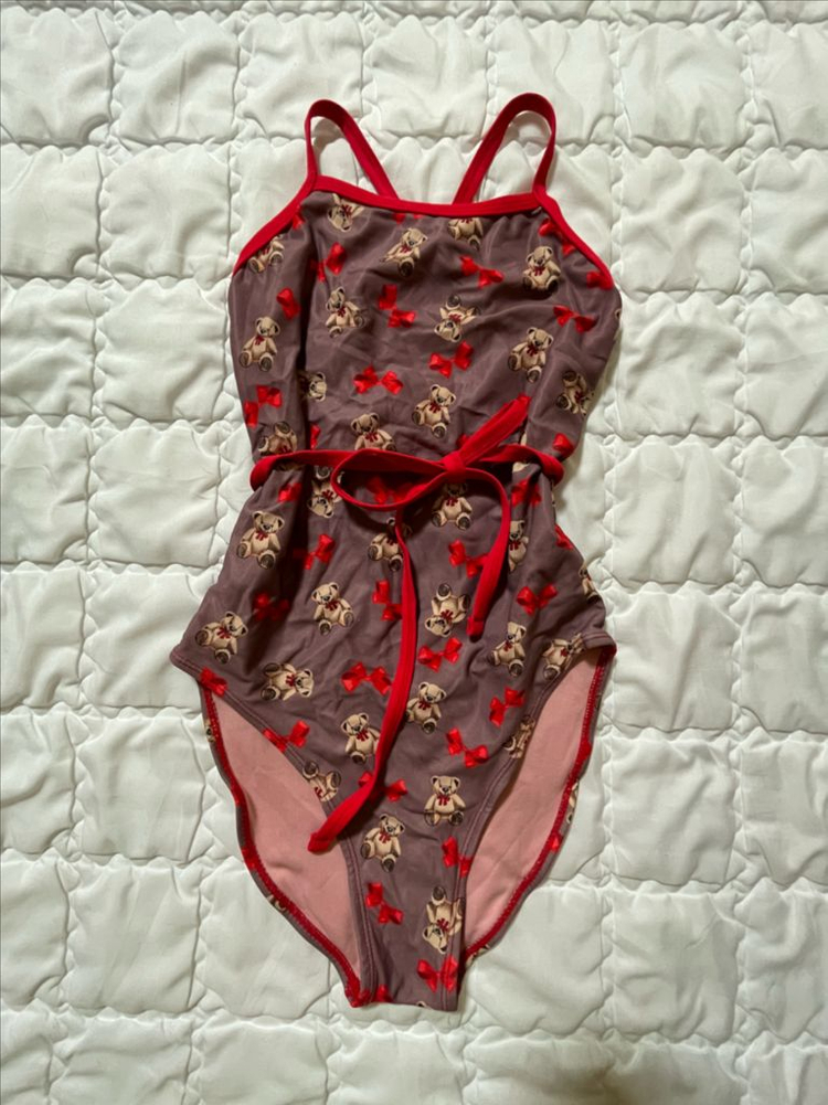 풀타임 해피베어S 수영복입니다. 63000원에 구매했으며, 곰돌이와 리본패턴이 들어가 있어요. 사이즈는 S 입니다. 재입고 되었을때 구입한거고, 착용횟수는 5회정도 입수품으로, 사용감있어요. 재질: 겉감 폴리에스터 100% (이탈리아), 안감 폴리에스터 100%