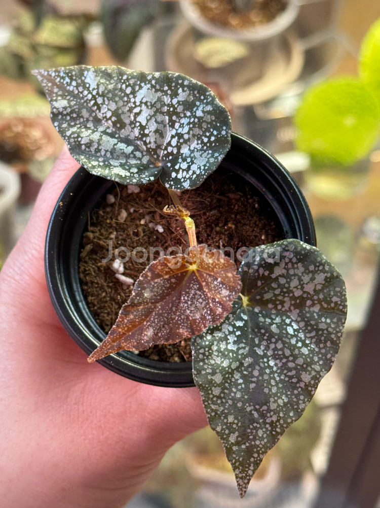베고니아 무나입니다. 잎에 반짝반짝 갤럭시가 보이네요^^ 밀폐케어 중입니다. 면책동의 하에 우체국 택배 발송 합니다.