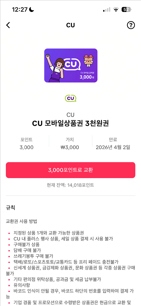 개인정보(거래정보)를 주고받는 행위는 사기에 노출될 수 있으므로 즉시 중고나라로 신고해 주세요편의점에서 사용 가능한 3,000포인트 상품권이에요. 2026년 4월 2일까지 사용 가능하고 상태 양호합니다.