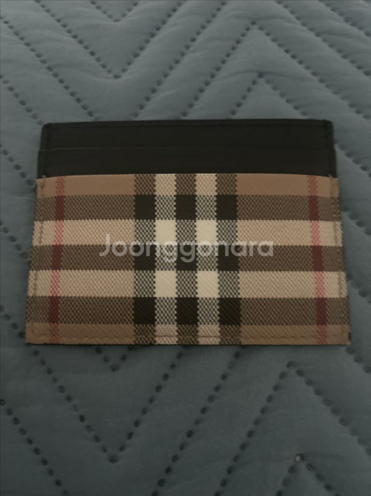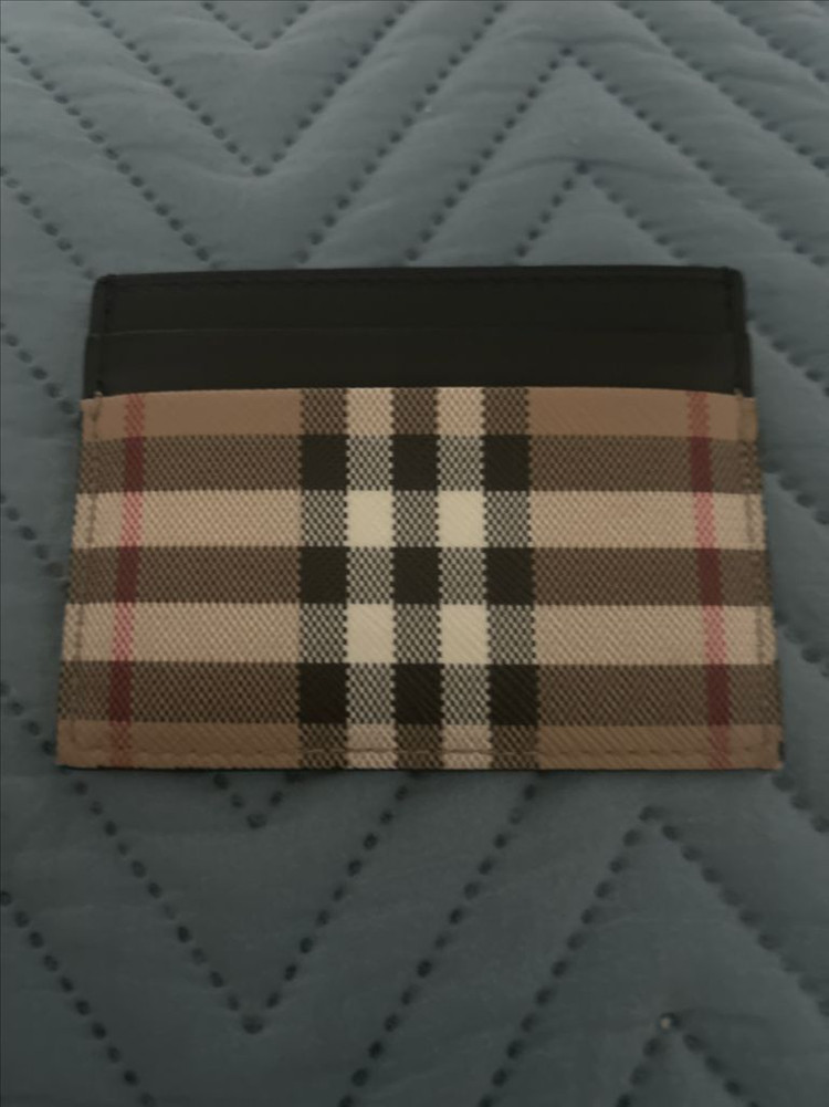시그니처 체크 패턴의 카드홀더예요. 베이지와 브라운 컬러가 조화롭고 고급스러운 느낌이 나네요. 사용감은 있지만 전체적으로 깔끔한 상태입니다.