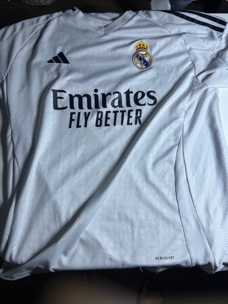 레알마드리드 유니폼입니다 실착 횟수가 몇 번 안됩니다 세탁 다 해놓은 상태입니다 사이즈:2Xl라고 되어있는데 XL정도임