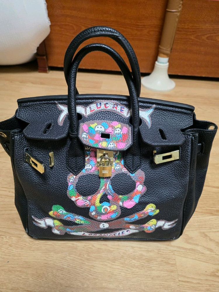 정품 버킨백으로 귀여운 스컬 디자인이 포인트예요. 사용감은 있지만 전체적으로 깔끔한 상태입니다. 특유의 고급스러운 마감과 실용성을 모두 갖춘 명품 가방이에요. 크로스끈도 있어서 편하게 메시기도좋아요