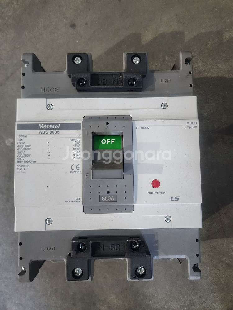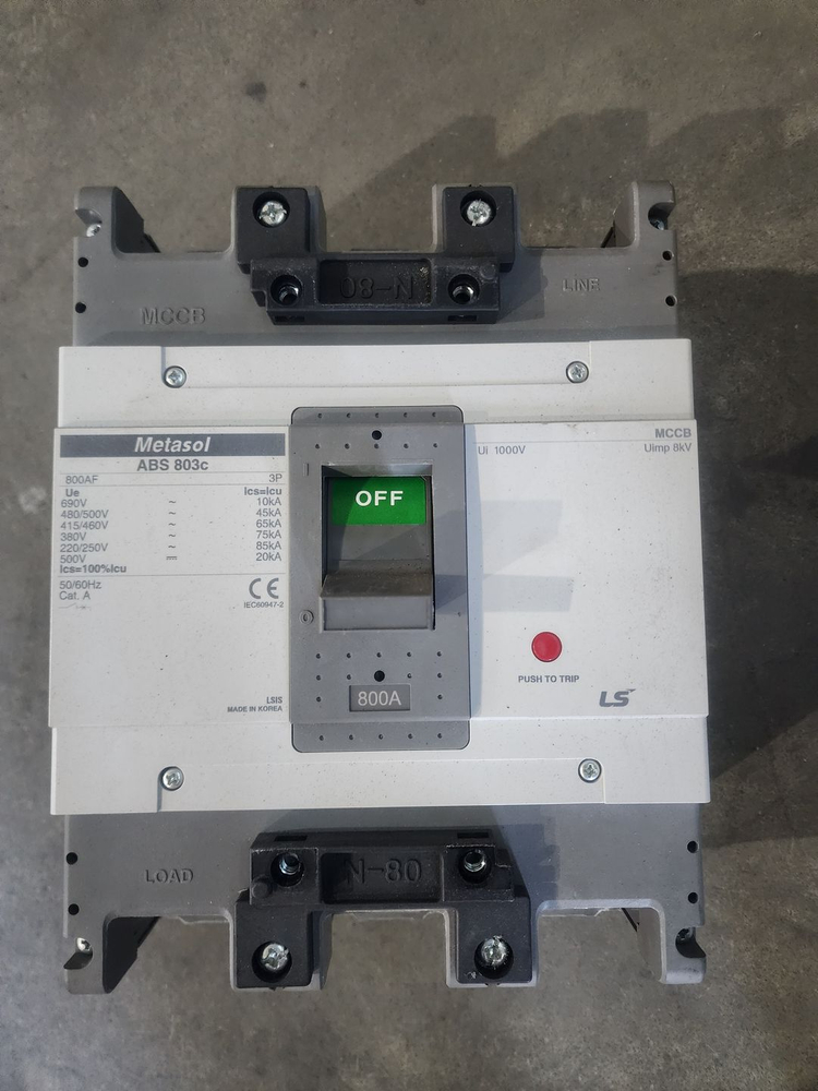 LS ELECTRIC(구 LS산전) Metasol 시리즈 배선용차단기(MCCB) ABS 803c 800AF 800A 3P. 정격 프레임 800AF, 정격전류 800A, 3극(3P) 구조의 몰드케이스 차단기로 저압 배전반에서 과부하·단락(단락전류 최대 약 75kA @ 380V)을 차단하는 용도이다. AC 690V까지 사용 가능하며 IEC 60947-2 규격을 만족하는 산업용 차단기라 공장·빌딩 수배전반, 모터·분전반 보호 등에 쓰인다. 교환 환불 불가 착불입니다.