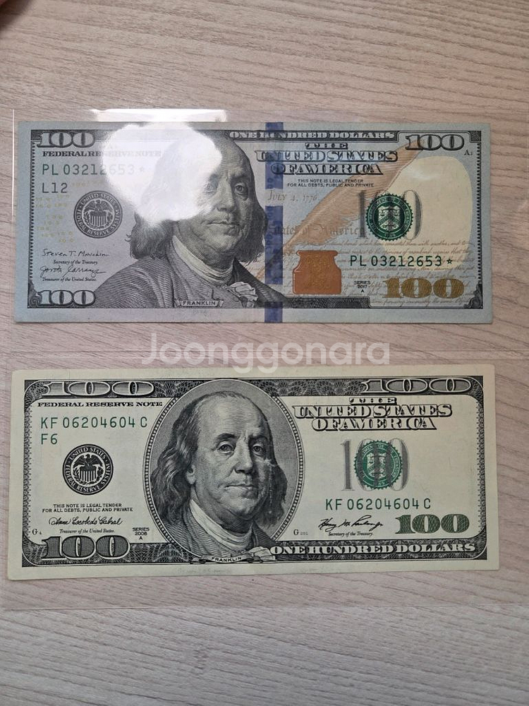 개인정보(거래정보)를 주고받는 행위는 사기에 노출될 수 있으므로 즉시 중고나라로 신고해 주세요2017년 스타노트 100달러 신권 지폐와 2006년 100달러 구권 지폐입니다. 구권 지폐는 보기 힘듭니다. 월요일, 수요일, 금요일, 흑석역에서 직거래 가능합니다. *현금거래만 합니다.