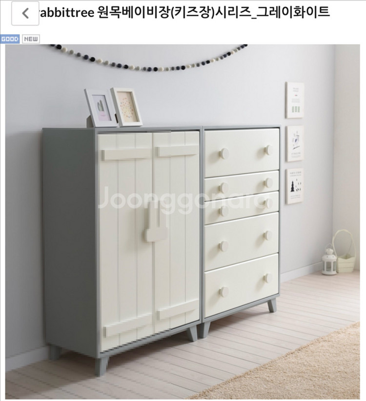 솜트리 원목베이비 옷장,서랍장 세트 (그레이/화이트) 2019년도에 구매했고 여자아이방에 둔 거라 변색 크게 없고 깨끗하게 사용했지만 중고이니 사용감은 있어요. 예민한 분은 피해주시고 사용감 있는 부분은 사진으로 올릴께요. 내부는 칸 모두 옵션으로 넣었고 정말 깨끗한 상태에요. 100만원이 넘는 가격대가 높은 제품이니 만큼 중고 가격 매리트는 있을거라 생각해요. 사이즈는 800옷장, 800서랍장 이에요. 컬러는 가장 인기가 많았던 그레이/화이트 조합 직접거래나 용달거래 희망