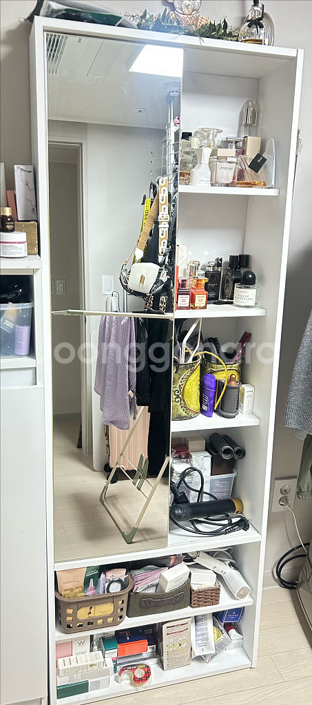 깔끔한 화이트 컬러의 화장대 수납장이에요. 거울과 다양한 수납공간이 있어서 화장품이나 소품 정리하기 정말 좋습니다. 약간의 사용감은 있지만 기능적으로는 문제없어요 거울 양쪽으로 움직입니다
